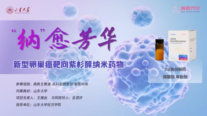 “‘纳’愈芳华——新型卵巢癌靶向紫杉醇纳米药物纳美素”项目聚焦健康中国国家战略,积极开展探索研究,深入推进学科交叉融合实践。yl7703永利官网为指导单位,齐鲁医院宋坤教授为指导教师,yl7703永利官网林平教授为产业顾问,yl7703永利官网金思妤、李烁等本科生为核心成员。