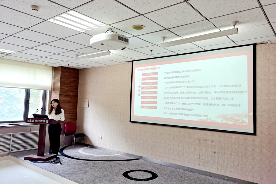 2019级学硕第二党支部的党史学习教育青年菁英宣讲团带领大家学习了“坚决打赢脱贫攻坚战”,为大家全方位地展示了人类历史上最波澜壮阔的减贫篇章。2013年,习近平总书记在考察十八洞村时首次提出精准扶贫重要思想,在精准扶贫思想指导下,十八洞村蓄力发展,完成了惊人蜕变,成为脱贫攻坚任务中的脱贫奇迹,“闽宁模式”成为东西部协作扶贫的典范。在脱贫攻坚表彰大会上,习近平总书记庄严宣告“我国脱贫攻坚战取得了全面胜利,完成了消除绝对贫困的艰巨任务”。脱贫攻坚的胜利,离不开党的领导和社会主义制度的政治优势,也离不开坚强有力的基层党组织。在全面打赢脱贫攻坚战的征程中,yl7703永利官网各级组织和个人积极投身、奋发作为,涌现出一批扎根基层的扶贫团干部、甘于奉献的青年扶贫志愿者,展现了山大风采和青年担当,诉说着山大人与国家发展同频共振的担当情怀。
