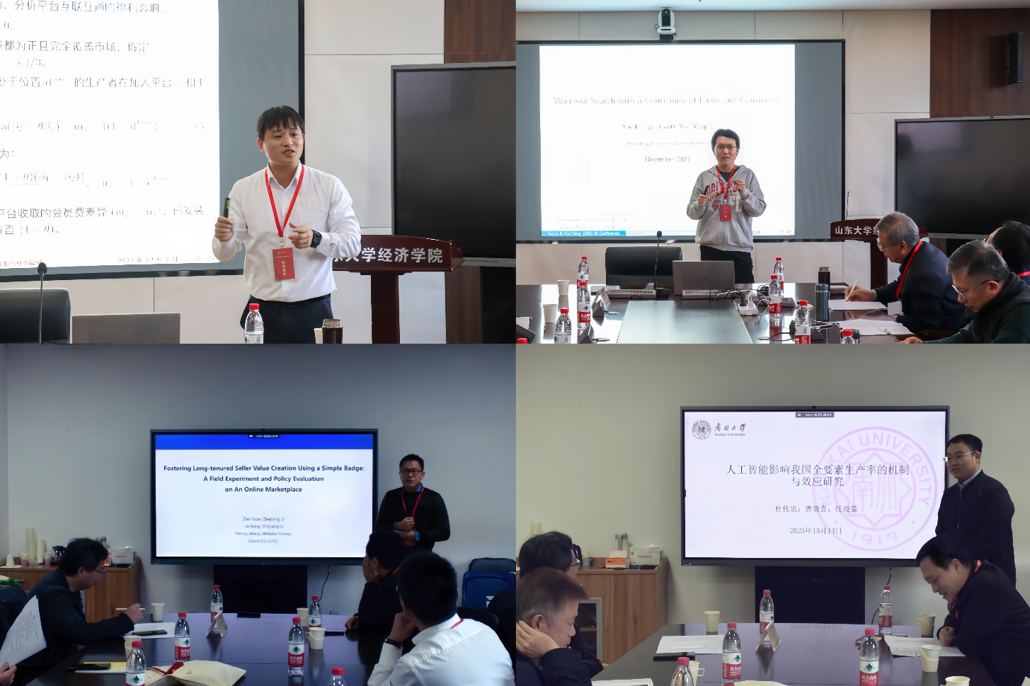 下半场报告环节由江西财经大学王自力教授和中央财经大学史宇鹏教授主持。中国社会科学院欧阳耀福副研究员报告了论文《平台互联互通、创新与社会福利》,分析了优劣势平台对互联互通的态度,以及创新激励对企业利润、平台利润和社会福利的影响。浙江大学袁哲研究员报告了论文《Fostering Longtenured Seller Value Creation Using a Simple Badge: A Field Experiment and Policy Evaluation on An Online Marketplace》,论文基于平台卖家声誉,通过随机试验研究了激励长期卖家并保持平台持续增长问题。yl7703永利官网李越助理研究员报告了论文《Wolinsky Search with a ContinuumFirms and Consumers》,分析了连续企业和消费者框架下,消费者搜索和市场动态等问题。南开大学曹效喜博士报告了论文《人工智能影响我国全要素生产率的机制与效应研究》,从要素配置效率、企业成本和企业研发能力三个层面,分析了人工智能影响全要素生产率的机制。