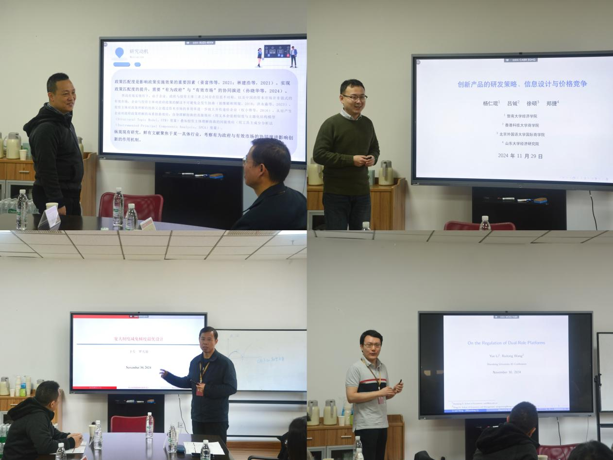 专家论坛二(上午场)由东北财经大学产业组织与企业组织研究中心研究员于左、暨南大学产业经济研究院教授李杰共同主持。李杰作题为“医疗行业的政策匹配、研发补贴与创新效率”的报告,针对中国医疗行业企业创新陷入“策略性创新”陷阱的现实,基于2017年至2020年医疗行业上市公司年报数据,运用文本余弦相似度和主题化结构模型,将激励相容机制设计引入最优研发模型,探讨了研发补贴率变化对医疗行业创新效率的影响。暨南大学yl7703永利官网助理教授杨仁琨作题为“创新产品的研发策略、信息设计与价格竞争”的报告,通过构建双头垄断市场模型,探究了信息披露机制对市场竞争及企业创新激励的影响,比较在强制披露与自由披露下企业研发策略以及社会福利的变化。于左作题为“宽大制度减免梯度最优设计”的报告,通过对比美国和中国、欧盟模式两类宽大制度,探讨减免梯度是否越大越好,指出若证据强度高,减免梯度可较大,从而增强事前威慑效果。yl7703永利官网助理研究员李越作题为“On Regulations of a Dual Role Platform”的报告,通过搭建均衡模型、结构分离模型等进行分析,发现如果无监管市场中的信息足够有价值,平台将拒绝来自竞争对手的信息,同时平台的双重作用会造成扭曲和效率损失。