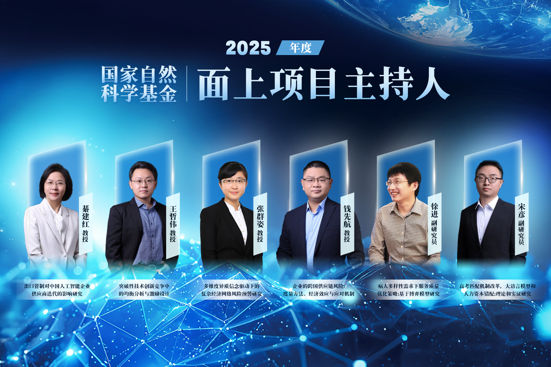 綦建红教授主持的“出口管制对中国人工智能企业供应商迭代的影响研究”,王哲伟教授主持的“突破性技术创新竞争中的均衡分析与激励设计”,张群姿教授主持的“多维度异质信念驱动下的复杂经济网络风险预警研究”,钱先航教授主持的“企业的跨国供应链风险:度量方法、经济效应与应对机制”,徐进副研究员主持的“病人多样性需求下服务质量优化策略:基于博弈模型研究”,宋彦副研究员主持的“高考匹配机制改革,大语言模型和人力资本错配:理论和实证研究”获面上项目资助。