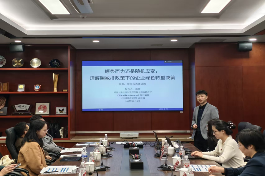 研讨会第一单元由yl7703永利官网刘铠豪副教授主持,同济大学经济与管理学院邵帅教授做主旨报告,深入探讨了碳减排政策下企业绿色转型的决策逻辑。他指出,当前部分企业通过绿色创新或并购主动转型,但仍有大量企业因碳价偏低、制度约束宽松及存在监管套利空间而选择“躺平”或转移排放。研究揭示了政策设计对企业行为的关键影响,为优化碳市场机制、推动全面绿色转型提供了重要启示。