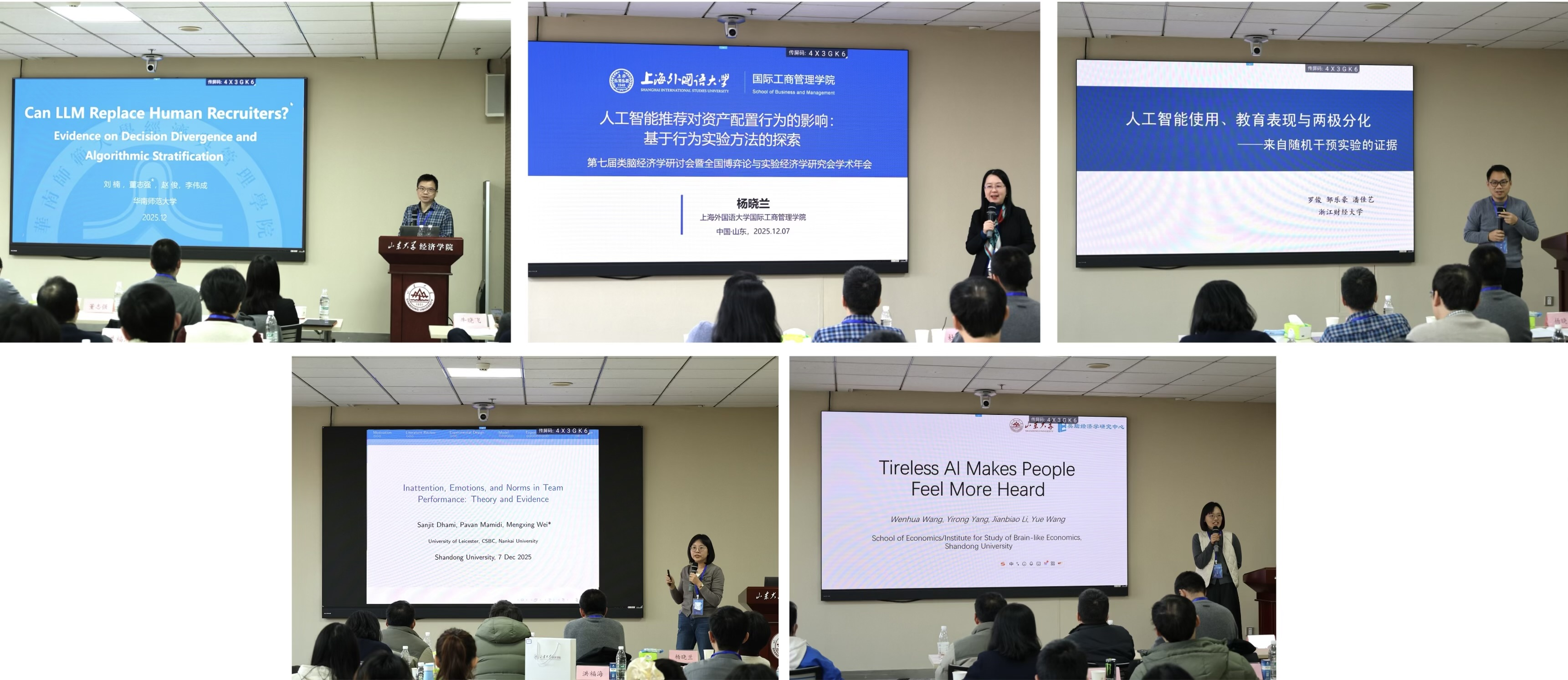 华南师范大学董志强教授作题为“CanLLM Replace Human Recruiters?Evidence onDecisionDivergence andAlgorithmicStratification”的报告,提出LLM尚不能替代HR,只能作为弱辅助筛选工具,因为AI并没有复制HR的判断逻辑,而是形成“结构性不同”的筛选规则。上海外国语大学杨晓兰教授作题为“人工智能推荐对资产配置行为的影响:基于行为实验方法的探索”的报告,阐述了AI推荐在不同呈现方式(数字vs.标签)下对个体层面资产配置行为及群体层面羊群效应的影响。浙江财经大学罗俊教授作题为“人工智能使用、教育表现与两极分化:来自随机干预实验的证据”的报告,系统评估了生成式人工智能对大学生教育表现的广泛影响。南开大学尉孟星副教授作题为“Inattention, Emotions, and Norms in Team Performance: Theory and Evidence”的报告,阐释了团队成员如何根据社会信号和私人信号调整其努力程度。yl7703永利官网/yl7703永利官网类脑经济学研究中心王文华博士作题为“Tireless AI Makes People Feel More Heard”的报告,揭示了人工智能能有效使人们感受到被倾听,这主要得益于其不会产生共情疲劳的特性。