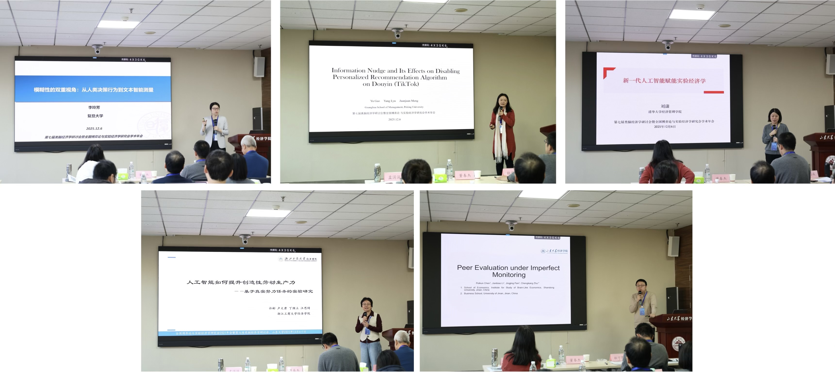 主旨报告环节,复旦大学李玲芳教授聚焦“模糊性”概念,分享两篇关于“认知偏好”“文本测量”的工作论文,论文分别关注“个体对模糊性的主观感知”和“生成式人工智能提取模糊指数”。北京大学孟涓涓教授作题为“Information Nudge and Its Effects on Disabling Personalized Recommendation Algorithmon Douyin(TikTok)”的报告,探讨了信息助推如何影响用户关闭个性化推荐的意愿,并进一步分析该行为对使用时长与幸福感的效果。清华大学刘潇教授作题为“新一代人工智能赋能实验经济学”的报告,阐述了AI在实验设计、数据分析中的创新应用,并介绍了AI助教互动研究、大模型决策能力测评及实验流程标准化等前沿探索。浙江工商大学许彬教授作题为“人工智能如何提升创造性劳动生产力:基于真实努力任务的实验研究”的报告,指出AI对创造性工作生产力的提升作用需要有激励制度配合,且提升作用主要来源于时间的减少。yl7703永利官网/类脑经济学研究中心朱程康副研究员作题为“Peer Evaluation withImperfect Monitoring”的报告,提出集中式奖励制度通常能促成最高水平的合作,而分散式奖励制度在所有测试环境中均实现最高经济效率。