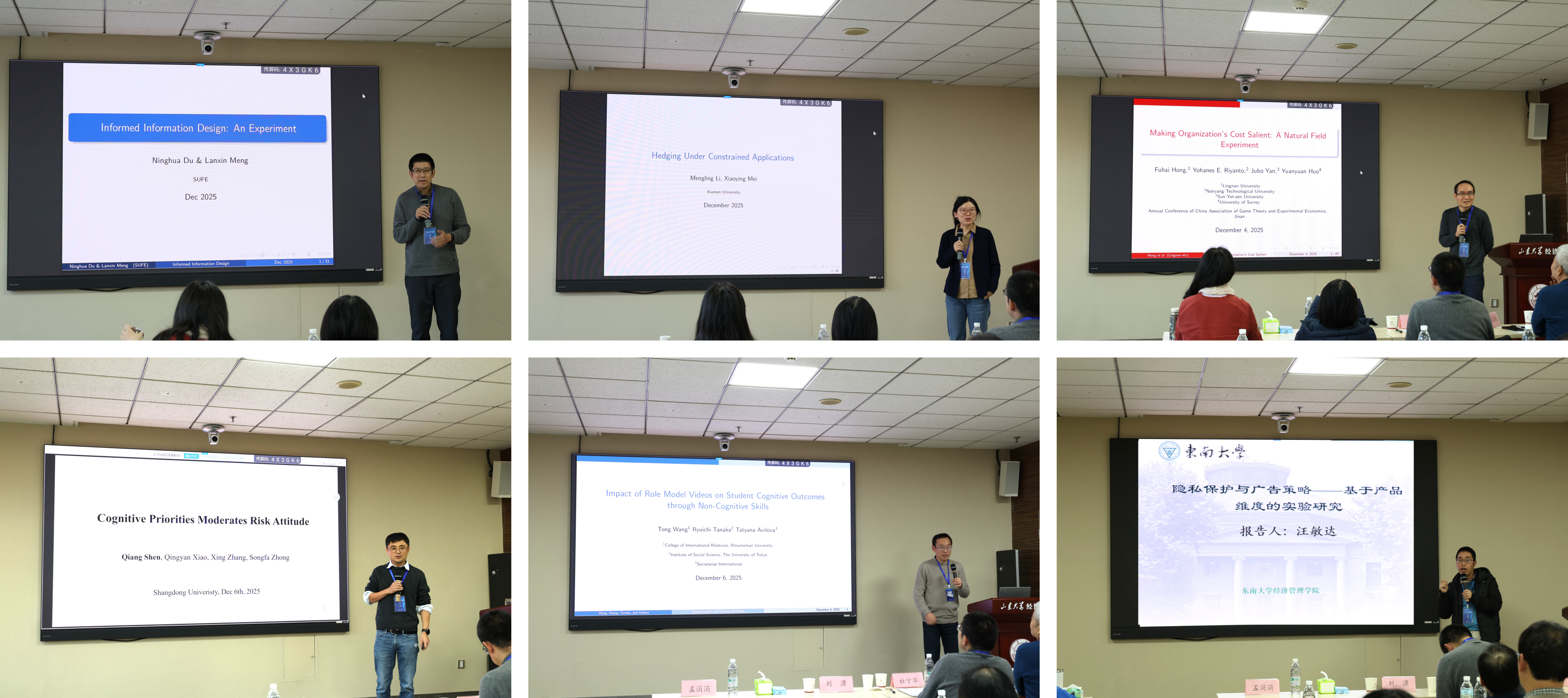 上海财经大学杜宁华教授作题为“Informed Information Design: An Experiment”的报告,对比分析“知情”与“不知情”信息设计对厂商信息披露行为及消费者决策的作用差异。厦门大学李梦玲教授作题为“Hedging under Constrained Applications”的报告,考察不同录取规则、志愿数量限制等因素如何共同作用于学生最优志愿填报策略。香港岭南大学洪福海副教授作题为“Making Organization's Cost Salient: A Natural Field Experiment”的报告,揭示了提高公共资源使用成本的显著性对个体成员订购行为的影响。上海外国语大学沈强教授作题为“Cognitive Priorities Moderate Risk Attitude”的报告,研究自我与他人场景下个体风险偏好的差异并通过鼠标追踪和眼动追踪数据刻画潜在的决策过程。立命馆大学王通教授作题为“Impact of Role Model Videos on Student Cognitive Outcomes and Non-Cognitive Skills”的报告,阐述榜样视频对学生认知影响的相关研究。东南大学汪敏达教授作题为“Privacy Protection and Firm's Advertising Strategy Considering Multiple Attributes of Product: An Experimental Study”的报告,探讨不同的消费者隐私保护水平下,厂商如何制定广告内容的问题。