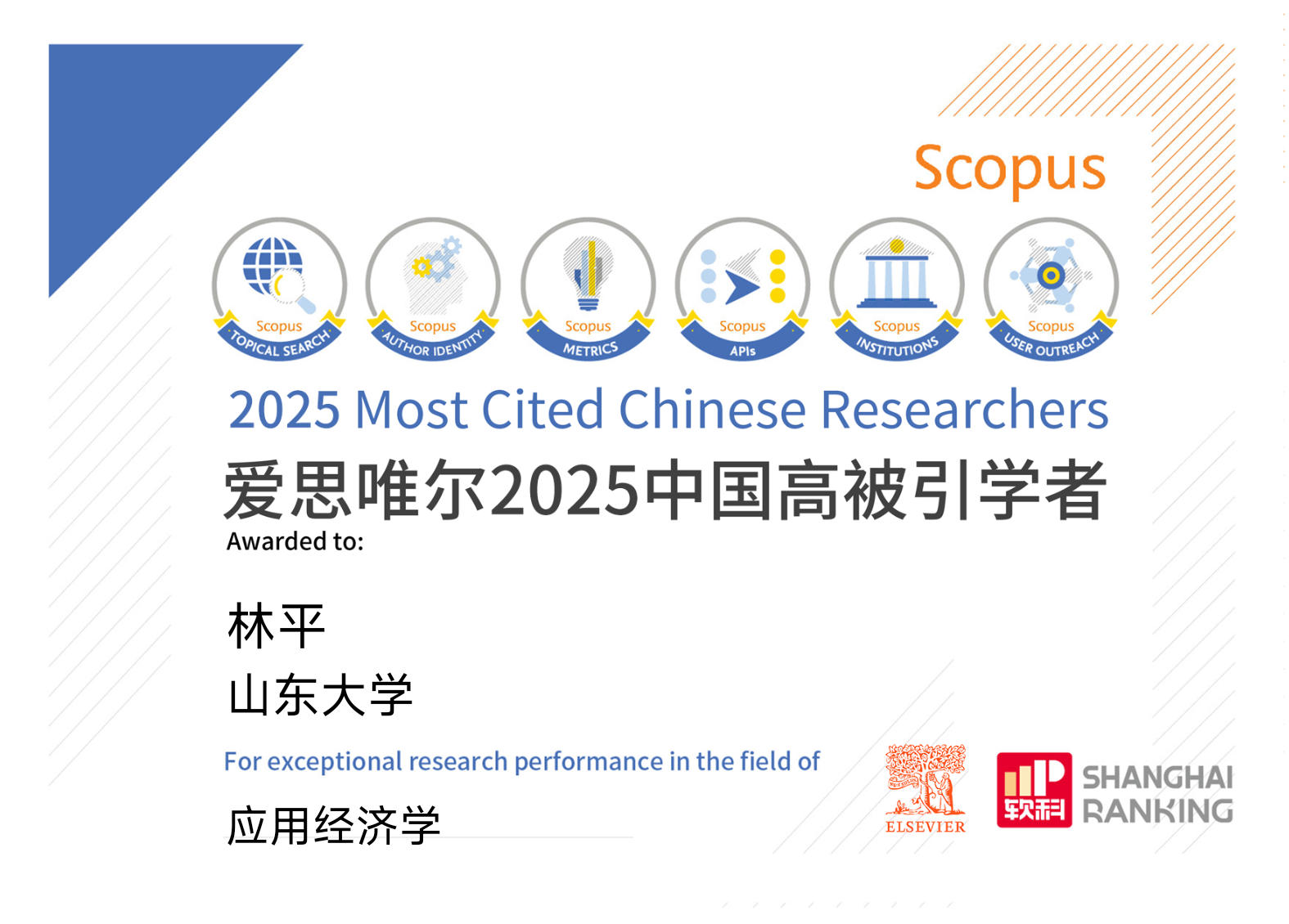 1月30日,爱思唯尔(Elsevier)发布2025“中国高被引学者”(Highly Cited Chinese Researchers)榜单。yl7703永利官网林平教授连续五年入选应用经济学学科榜单。
