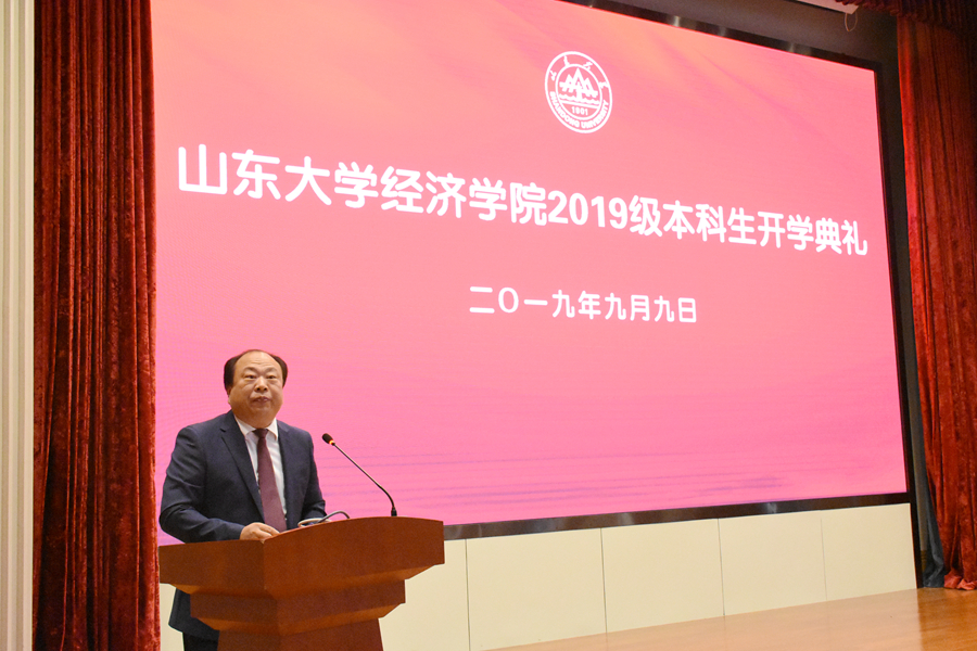 典礼在雄壮的国歌声中拉开帷幕,曹廷求在致辞中代表学院向全体本科新生表示欢迎,他围绕“经世济民,同心追梦”主题展开,他指出经院学子要立足中国,面向世界,胸怀经世济民理想。在全球治理体系发生深刻变化的当今世界,中国发展面临前所未有的机遇和挑战;中国经济发展研究的当务之急是把握时代经济发展规律,加速构建中国特色社会主义经济理论;作为新时代大学生,要有新担当,新作为,放眼长远,着眼未来,从中国特色、中国国情入手,推动中国理论革新,为中国经济发展作出贡献。他希望新生要选择奋斗,全面发展,把实现中华民族伟大复兴的中国梦、建设世界一流大学的山大梦、建设一流学院的经院梦、德智体美劳全面发展的个人梦有机结合起来,养浩然之气,求无境之学,涵养家国情怀,勇攀高峰,砥砺前行,为实现中国梦贡献青春力量。