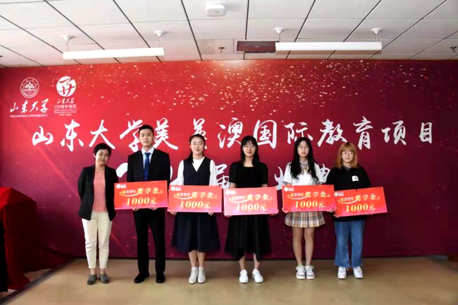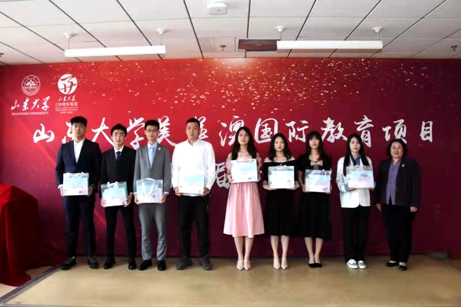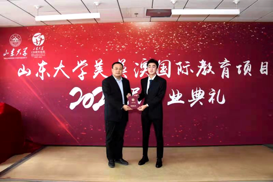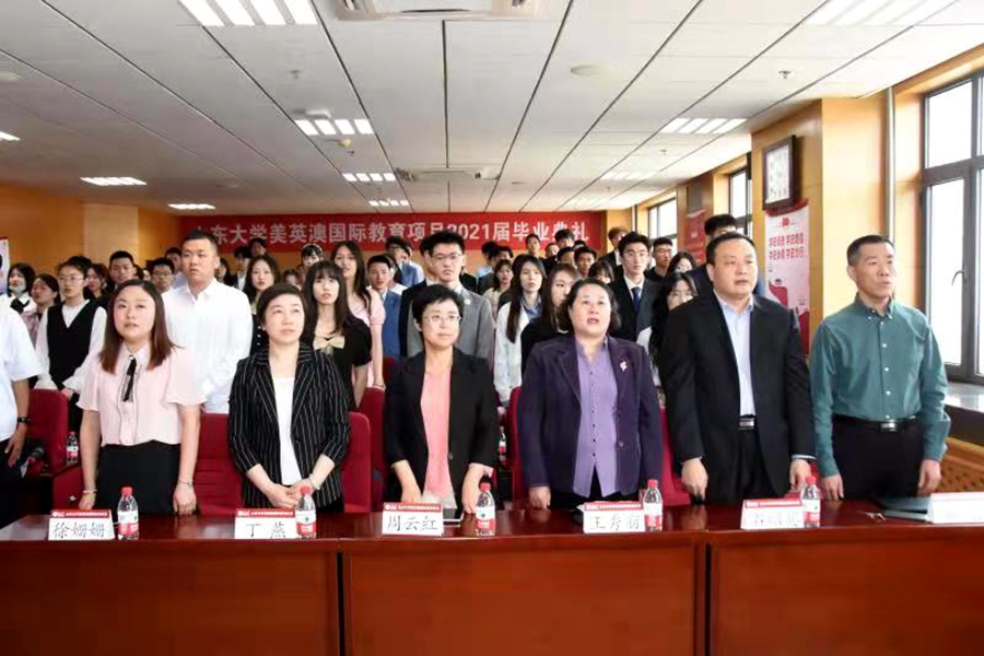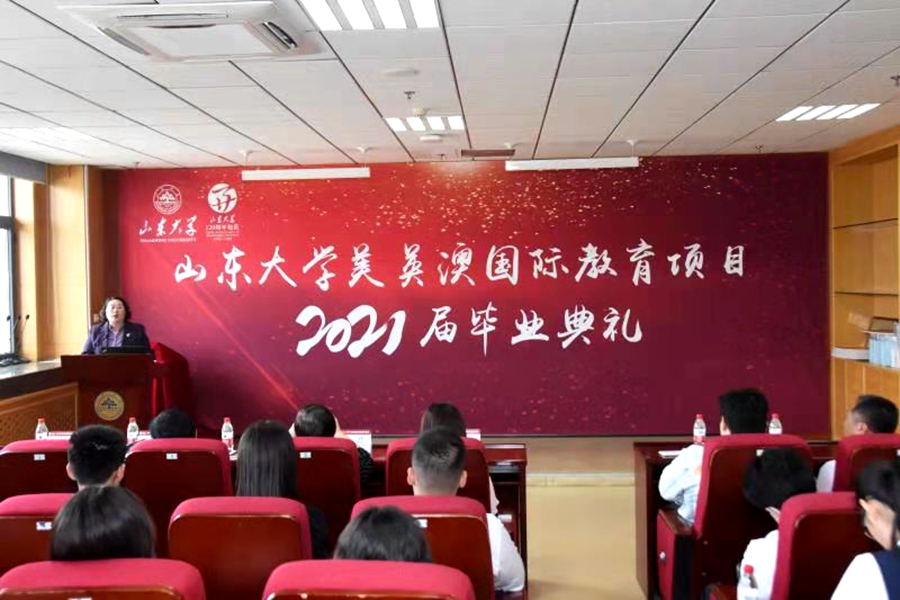 上午9:30,在庄严嘹亮的国歌声中,毕业典礼拉开序幕。周云红首先在典礼上致辞,她对同学们顺利完成山大学业表示祝贺的同时,提出两点希望:一是出国后勤奋学习,把自己培养成为具有国际化视野和创新能力的高素质优秀人才,展示中国形象,传播中国文化;二是将山大人立身养德的坚守、不断创新的追求、胸怀天下的担当融入骨血,去涵养家国天下的情怀,乘风破浪,创造人生的无限可能。王秀丽在致辞中对美英澳2021届毕业生取得的成绩表示祝贺,对辛勤付出的老师表示感谢,她希望同学们做讲诚信、有道德、重责任、懂奉献的合格山大人,传播山大文化,弘扬山大精神,以优异的成绩回报祖国。教师代表曲创鼓励同学门出国后要做到三点:一要勇敢面对挑战;二要坚持战胜困难;三要珍惜青春时光。留学部相关负责人针对海外学习、生活给同学们提出了建议,祝福大家学业顺利。校友代表刘乃嘉回顾了当年在山大的学习生活,感谢母校提供的平台与机会,寄语学弟学妹们怀揣报国理想,自信面对未来。优秀学生代表张书姮表达了对老师的感激之情和对对母校的依依惜别之情,衷心愿母校百廿华诞快乐!周云红和王秀丽分别为优秀毕业生颁发奖学金和毕业纪念品。石绍宾为每位毕业生颁发结业证书并合影留念。