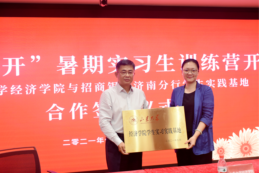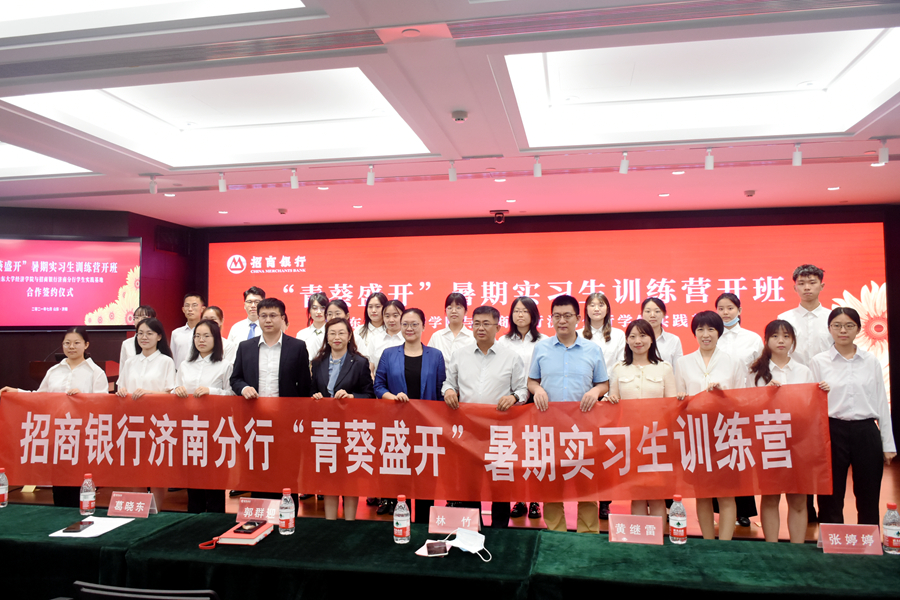 7月12日,yl7703永利官网与招商银行济南分行举行“青葵盛开”暑期实习生训练营开班暨学生实习实践基地合作签约仪式。招商银行济南分行公司金融事业部副总裁郭群迎、招商银行济南分行人力资源部总经理葛晓东、yl7703永利官网党委副书记林竹、指导教师代表黄继雷、辅导员张婷婷出席仪式。仪式由招商银行济南分行人力资源部副总经理孟丽霞主持。