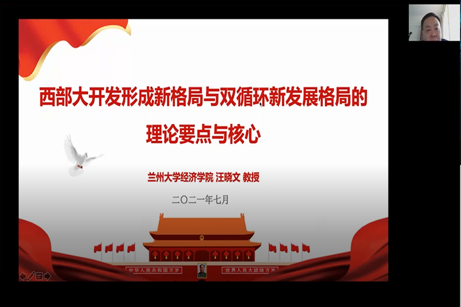 汪晓文的报告从西部大开发形成新格局理论、双循环新发展格局理论、西部大开发过去实施中面临的客观问题、双循环推动西部大开发形成新格局等方面展开。他首先回顾了西部大开发二十年的历史,GDP总量持续上升、产业结构不断优化、人民生活持续改善、生态环境日趋向好;西部大开发形成新格局的核心是促进经济高质量发展、以大开发促大发展、促进生态大保护、进一步深化改革、不断提高人民生活。随后他指出“双循环”是应对当前疫情以及恶劣的国际环境不得已而为之的战略转型,中国“内循环”有自身的经济、制度的优势和得天独厚的条件,双循环新发展格局的核心是处理与把握好几大重大关系。其次在西部大开发中面临开放型经济规模与竞争力相对不足、开放型经济对区域经济发展贡献较低、开放型经济的营商环境有待优化等客观问题。最后他认为西部地区在新发展格局下的总体定位是服务业开放高地、技术制度融合创新试验区、进口吸收转化聚集区、向西开放门户,为此西部地区应重视联动化、联通化、市场化相耦合的发展策略。