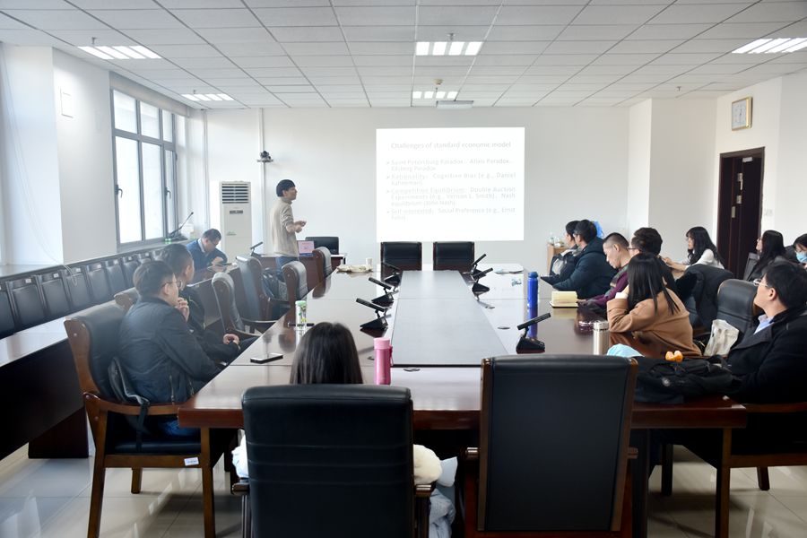 报告围绕神经经济学和神经金融学的发展历程、经济或金融决策中偏好与信念的神经基础以及个人研究成果三大方面展开论述。首先,报告指出行为经济学对传统经济学的完全理性、自利以及竞争均衡的假设提出了挑战,并逐渐构建起行为经济学的学科框架。在行为经济学基础上,学者进一步探究行为的起源问题,从而提出神经经济学。神经经济学是运用神经科学技术来确定与经济决策相关的神经机制的一门学科。随后,报告指出人的理性、思维以及逻辑等高级神经活动主要由大脑皮层负责,并且详细介绍了目前测试大脑神经反应的先进神经科学方法,包括功能性核磁共振、事件相关电位、经颈直流电刺激等。借用脑成像技术,可以直接测量认知和情感,从内部观察人的行为,进而加深我们对大脑与行为之间关系的理解。最后,报告了一篇个人研究成果,该研究采用一个序贯决策、放回式重复抽样、抽的小球种类不披露以及判断的盒子类型依次披露的实验,通过构建异权重信息模型,分析计算第N个人基于前面的信息将如何做出决策。报告结束后,参会老师就报告中的有关问题与牛晓飞进行了交流探讨。