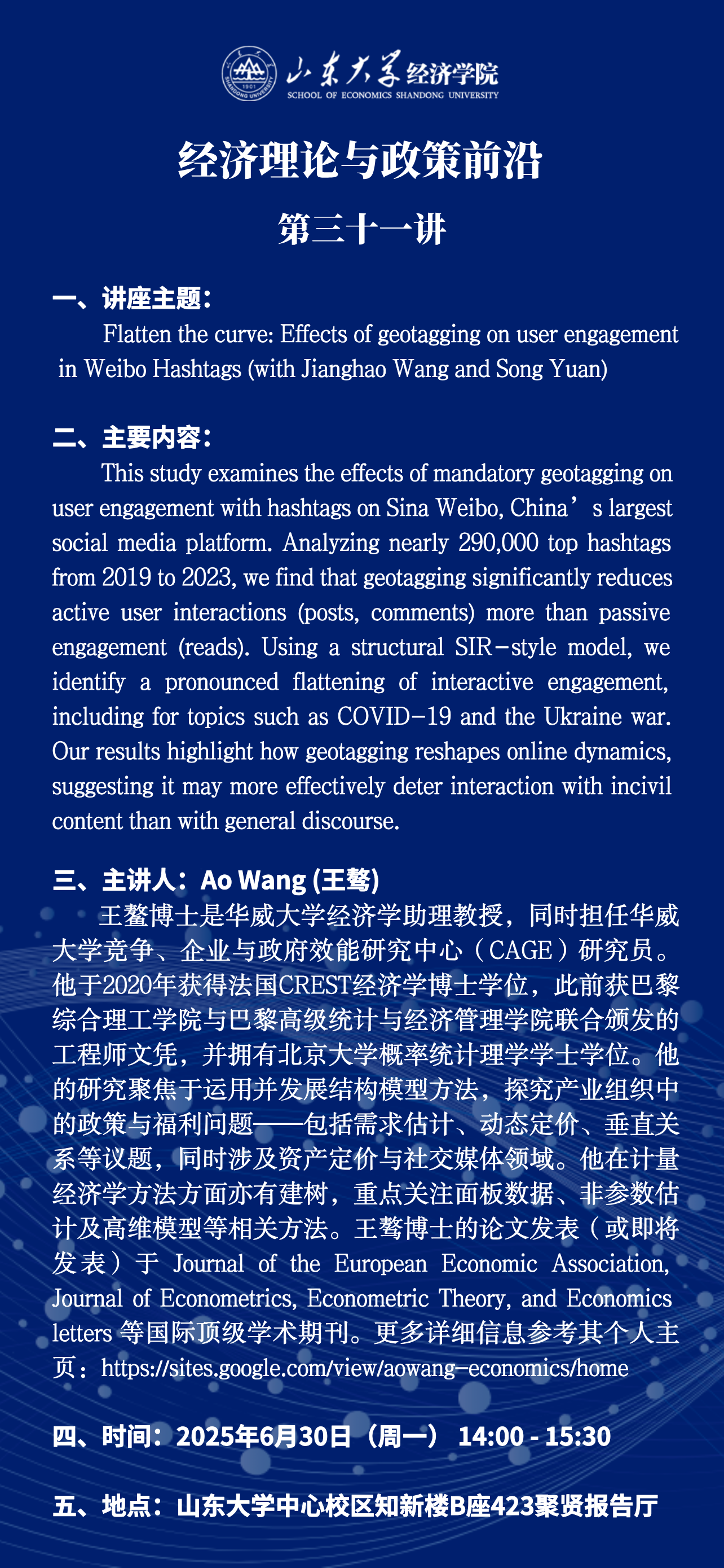 Flatten the curve:Effects of geotagging on user engagement in Weibo Hashtags(with Jianghao Wang and Song yuan)(经济理论与政策前沿第三十讲)