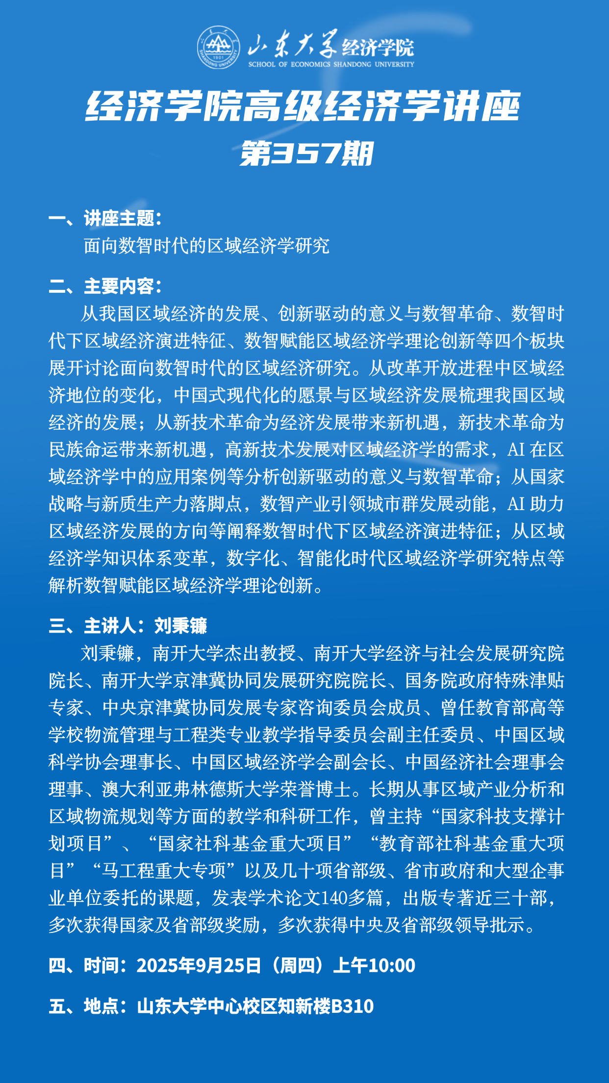 面向数智时代的区域经济学研究(yl7703永利官网高级经济学讲座第357期)