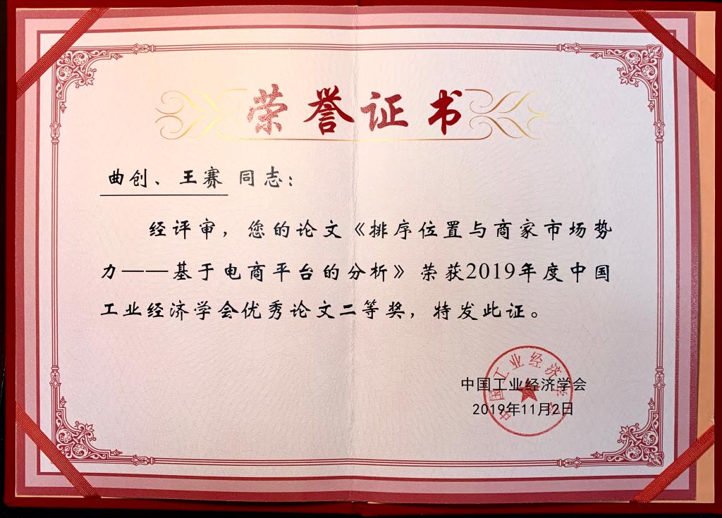 本次大会共评选出8篇优秀论文,曲创教授入选论文获“2019年中国工业经济学会优秀论文”二等奖。