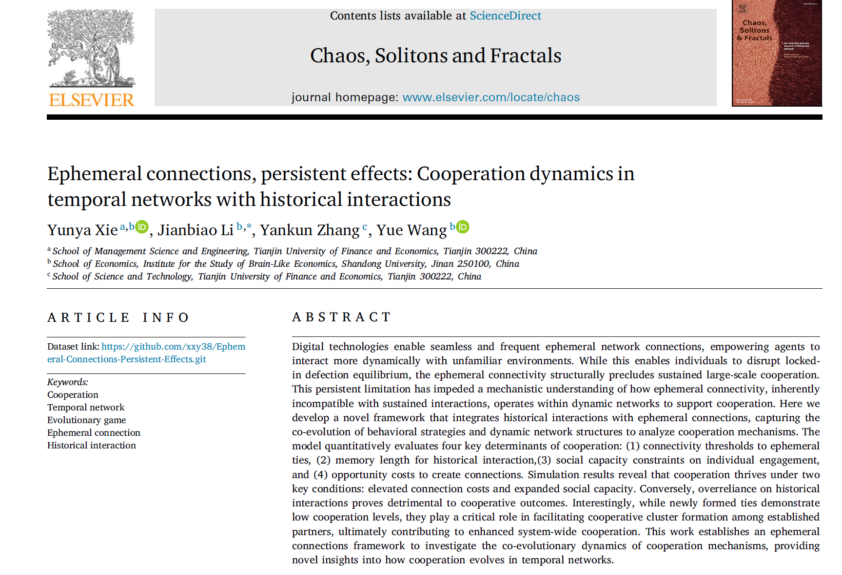 数字技术的广泛应用促进了人际间短暂而高频的跨区域互动。这种“短暂连接”不仅极大地扩展了人际交往的时空边界,还对合作行为的涌现与维持产生了深远影响。然而,目前行为科学、网络科学及社会经济领域对于这一现象的系统研究仍相对有限。近日,yl7703永利官网/类脑经济研究中心李建标教授团队在该领域取得重要进展,创新性地提出了“短暂连接-历史交互”融合框架,并揭示了短暂连接对合作涌现的促进规律及其内在机制。相关研究成果“Ephemeral Connections, Persistent Effects: Cooperation Dynamics in Temporal Networks with Historical Interactions”,已在Elsevier旗下国际高水平跨学科期刊Chaos, Solitons & Fractals在线发表。该论文由yl7703永利官网访问学者天津财经大学谢昀雅副教授、yl7703永利官网/类脑经济学研究中心李建标教授及博士生王粤等合作完成,谢昀雅副教授为论文第一作者,李建标教授为论文的通讯作者。